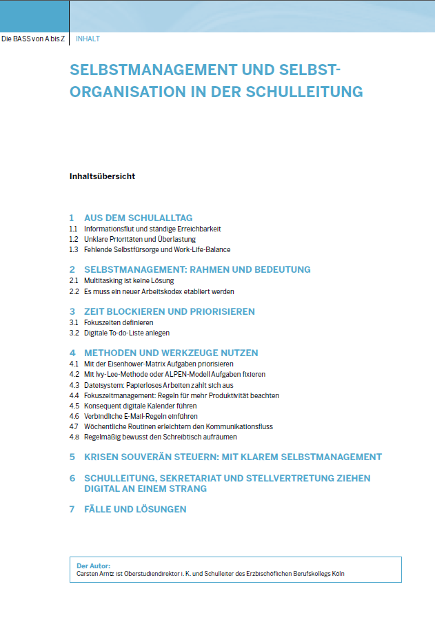 Dieses Themenheft von Carsten Arntz zeigt, wie Schulleitungen ihren Alltag mit klarer Haltung, gut geordneten Abläufen und einem verlässlichen Selbstmanagement so gestalten können, dass sie handlungsfähig bleiben.
