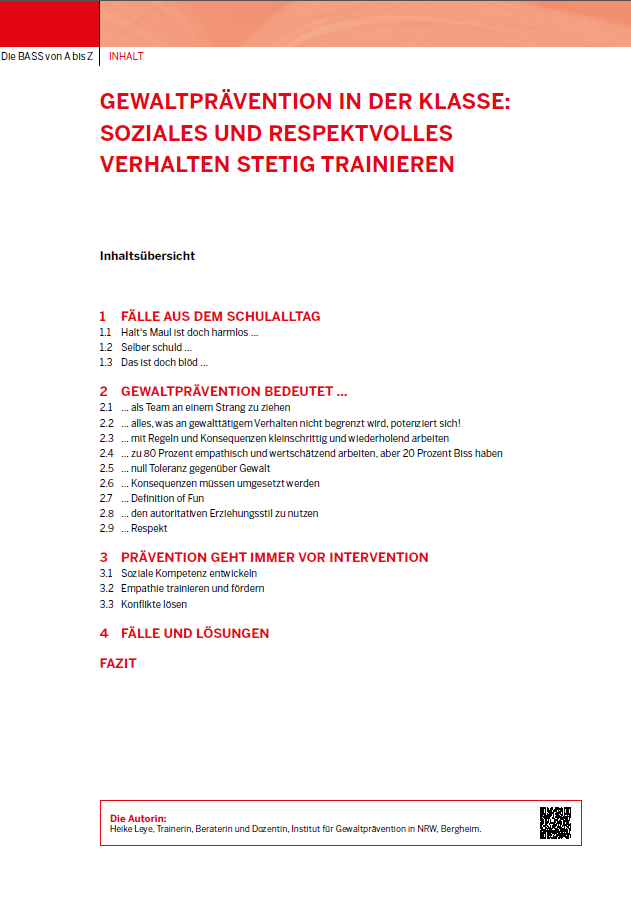 Gewaltprävention ist ein wichtiger Teil von einem gesunden Schulleben und enthält unterschiedliche Ebenen und Bausteine. Heike Leye konzentriert sich in diesem Themenheft auf die Praxis und nimmt den Baustein Klasse und Klassengemeinschaft in den Blick. Ihre Empfehlung: Trainieren Sie stetig soziales und respektvolles Verhalten!